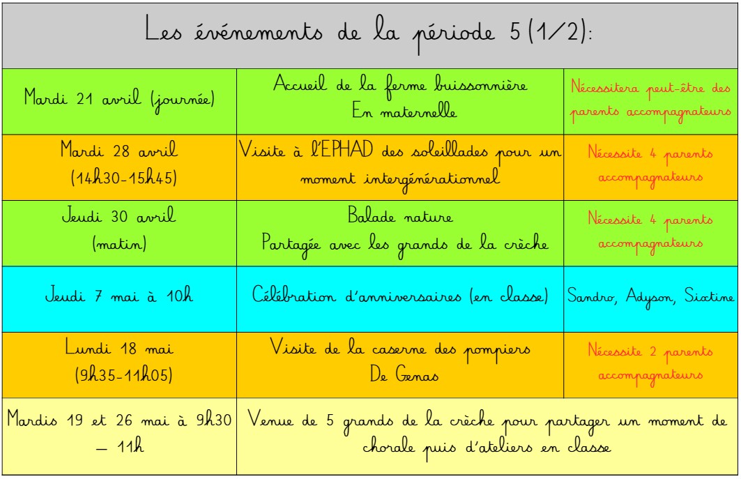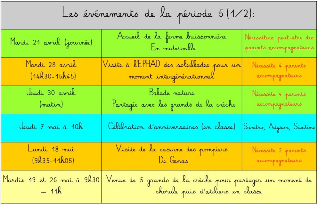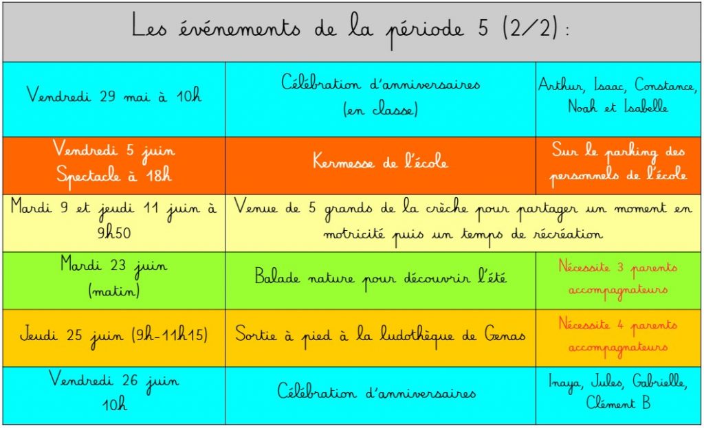 Voici les événements prévus sur les 5 périodes de l’année scolaire